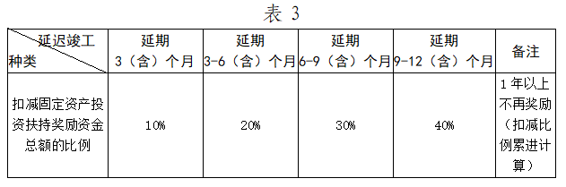 ?。ㄒ唬╉?xiàng)目按要求開工建設(shè),因自身原因建設(shè)進(jìn)度緩慢、延期竣工的,按照表3確定的比例累進(jìn)扣減扶持獎(jiǎng)勵(lì)資金,其他約定標(biāo)準(zhǔn)按照《招商引資合同》或《使用權(quán)出讓合同》執(zhí)行。