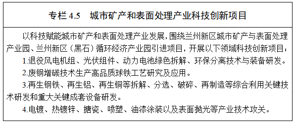 3.科技支撐城市礦產(chǎn)和表面處理產(chǎn)業(yè)發(fā)展。依托蘭州大學(xué)、蘭州理工大學(xué)、中聯(lián)西北設(shè)計院等研究機構(gòu)技術(shù)力量,開展城市礦產(chǎn)與表面處理產(chǎn)業(yè)園環(huán)境承載能力研究,為園區(qū)綠色循環(huán)可持續(xù)發(fā)展提供保障。以技術(shù)創(chuàng)新、管理創(chuàng)新為導(dǎo)向,以國際化、市場化、生態(tài)化為主要方式,圍繞提高再生資源回收、分揀、拆解、環(huán)保處理水平等,重點發(fā)展火車、汽車、家電、金屬制品、電池等產(chǎn)品拆解以及廢舊輪轂、玻璃、輪胎再利用技術(shù)攻關(guān),支持建設(shè)現(xiàn)代化專業(yè)分揀中心,城市礦產(chǎn)資源化利用等領(lǐng)域關(guān)鍵技術(shù)研發(fā),推廣應(yīng)用新技術(shù)、新工藝、新設(shè)備,大幅提高廢舊商品回收的現(xiàn)代化水平。圍繞汽車輪轂、平板玻璃來料加工等產(chǎn)業(yè)配套需求,重點開展電鍍、熱鍍鋅、搪瓷、噴塑、油漆涂裝以及表面拋光等產(chǎn)業(yè)技術(shù)攻關(guān)。