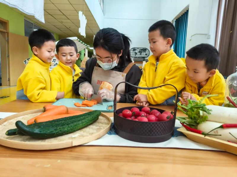 把豐收的果實搬進教室,小朋友們滿心歡喜地與每顆色彩斑斕的水果合影,定格下一個個活潑的瞬間;學著大人的樣子洗菜、切菜,普通的水果通過一雙雙小手變身成了美味誘人的罐頭;將蘿卜、土豆、蘋果深埋地下,用土壤作為天然的保鮮室,讓食物在寒冷的冬季里依然能保持鮮美……這不僅是一場對季節(jié)變換的探索,更是對生命教育、情感培養(yǎng)的一次深刻實踐,讓孩子們在體驗中學會感恩,于實踐中領(lǐng)悟成長。